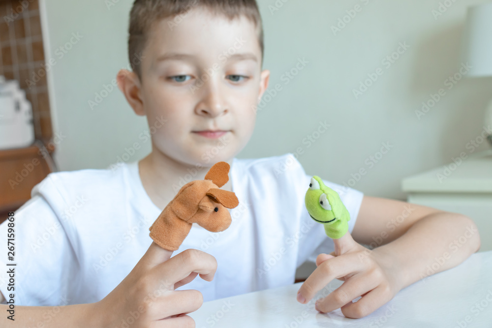 Glove doll with an opening mouth, a toy on the hand in the form of a hippo, isolated on a white background