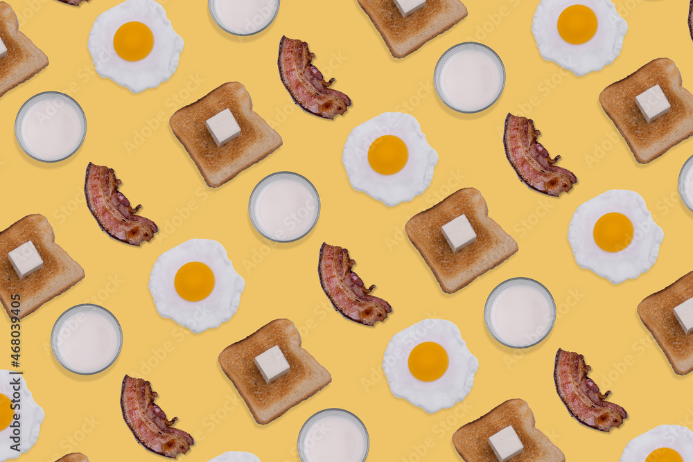 Pattern made with fried eggs, slices of crispy bacon, toast bread with butter and glasses of milk on pastel yellow background.