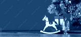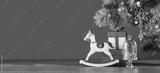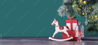 Christmas ornaments and gift boxes on green with snow. Rocking horse under Christmas tree. New Year greeting card. Copy space banner