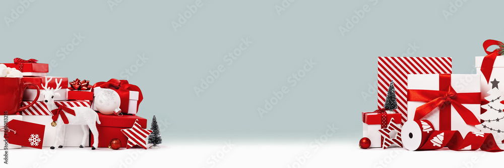 Big piles of assorted red and white gift boxes and ornaments with Christmas trees on winter blue background. Assorted size. Merry Christmas and Happy New Year gift shopping and sale concept banner