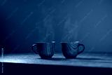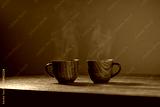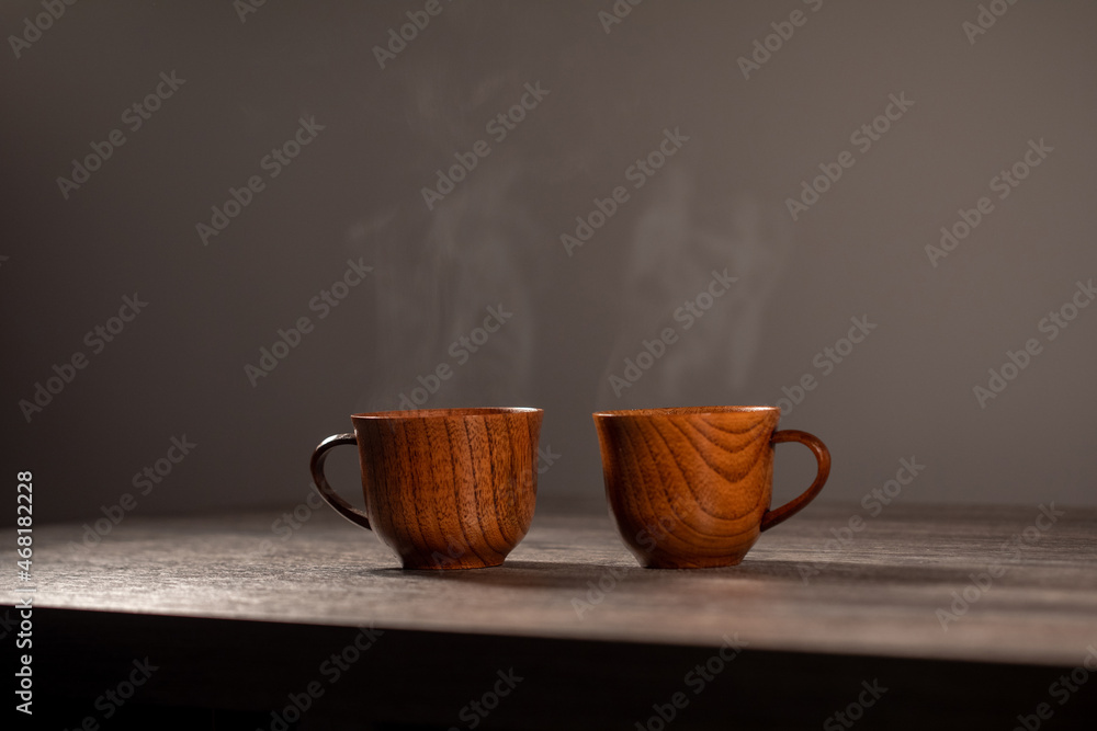 Wooden mug with coffee. Steam comes from the cup from hot coffee, chocolate, tea. Christmas lights in the background. Christmas is coming soon