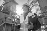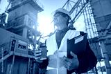 Cheerful male engineer standing on territory of manufacturing plant and smiling while holding takeaway drink and folder with papers