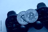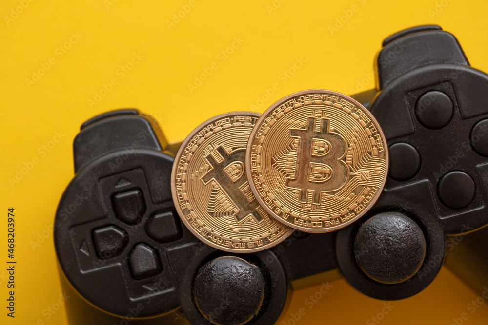 Crypto gaming concept. Video game controller with a bitcoin cryptocurrency coin