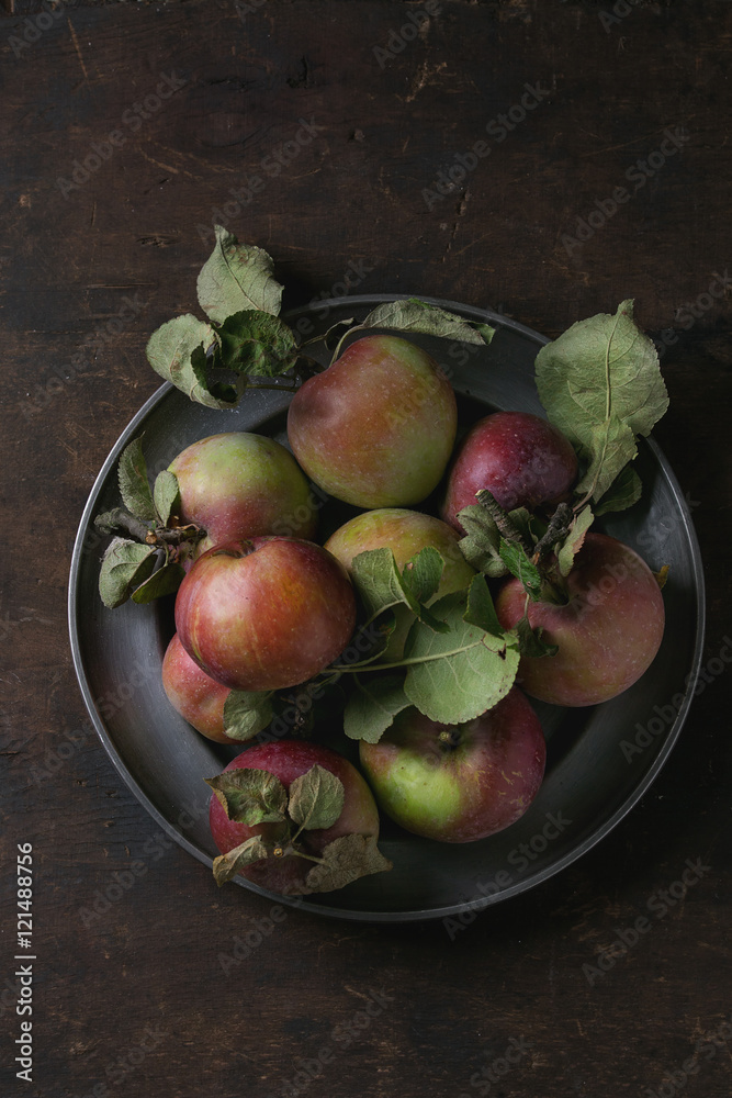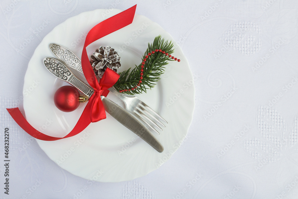 Christmas table setting on the white plate on the white textile background. Top view. Copy space.