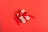 Gift box with tied red bow on the red background. Top view. Copy space.