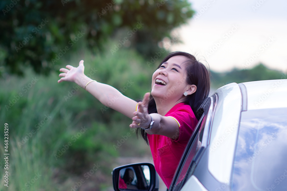 Happy woman looking out of car window with smile and relax