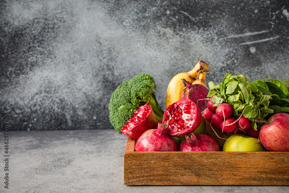 Selection of fresh fruit, greens, vegetables in wooden tray on grey stone background table, detox, diet, clean eating, vegetarian, healthy food concept, space for text