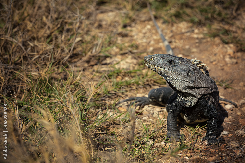 Iguana near the grass on the island of Isla Mujeres. Mexico