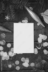 Christmas card mock up. Empty greeting card and christmas ornaments, decorations, confetti and pine branches on rustic wooden background. Flat lay. Space for text. Seasons greetings. Template