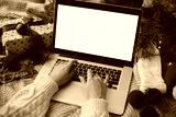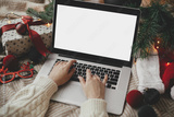Hands working on laptop with blank screen on cozy bed with stylish christmas ornaments, present and santa hat. Christmas shopping online and freelance in holidays. Space for text