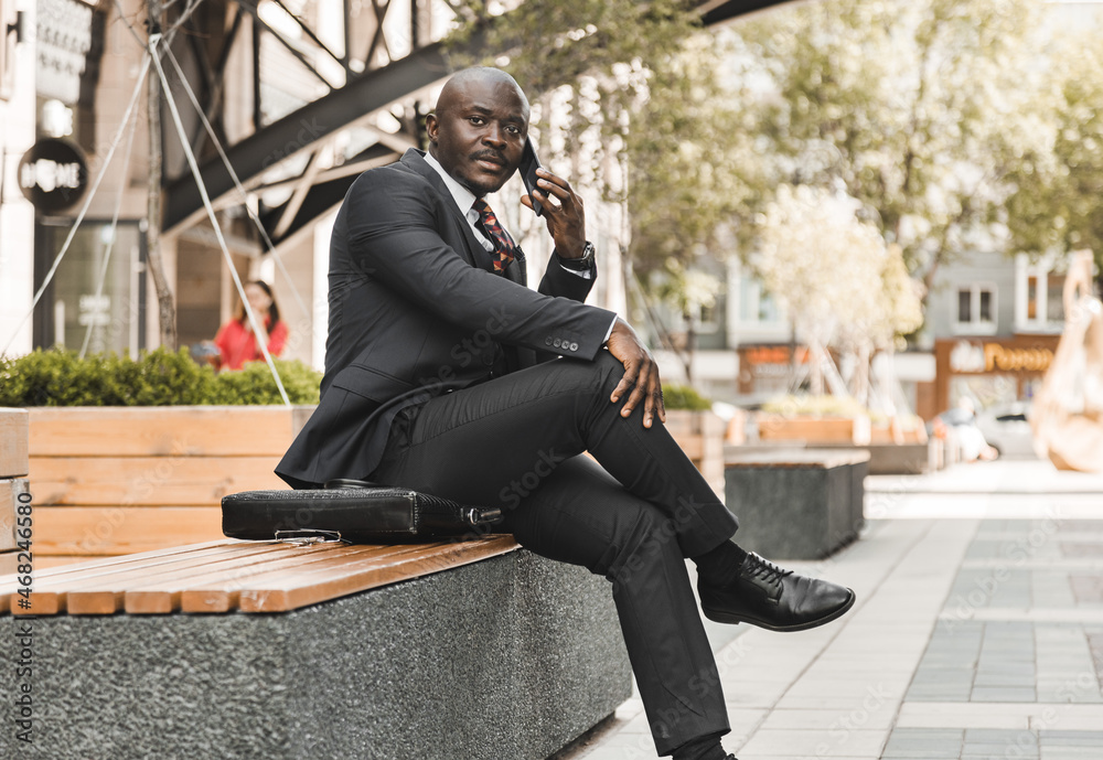 Portrait of a black African American businessman in a suit sits on a bench in a city park outdoors.