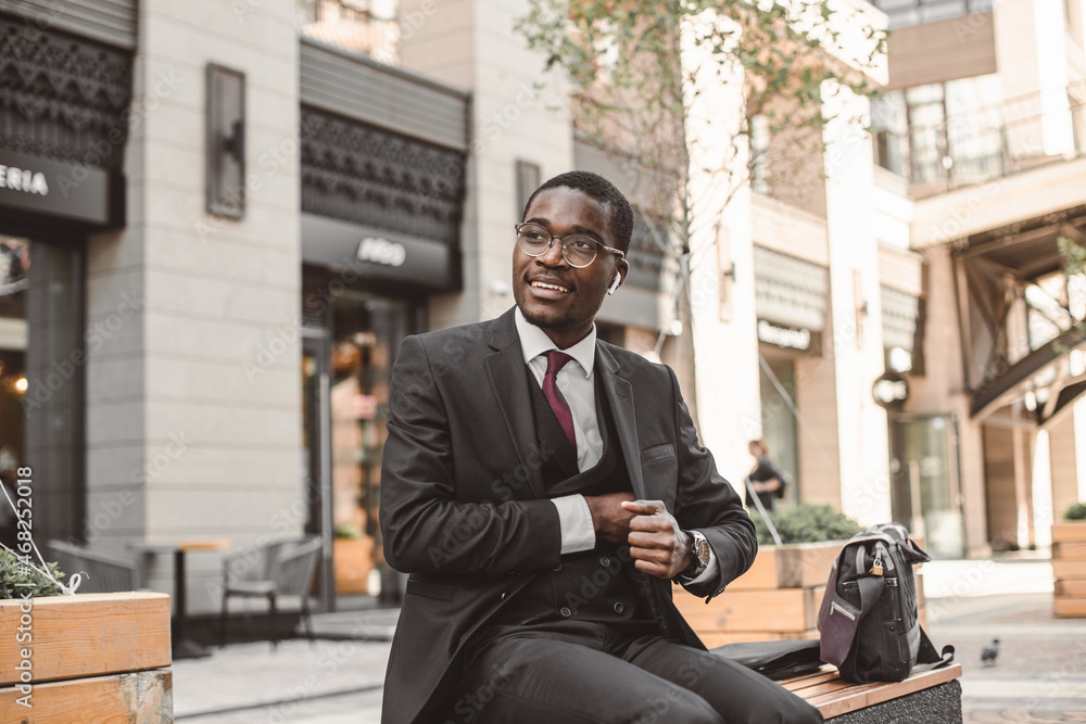 Portrait of black african american businessman in suit with glasses and headphones sits on the background of city buildings outdoors
