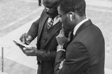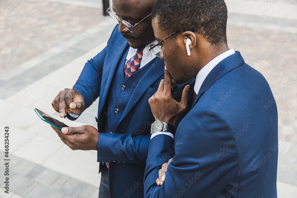 Meeting of two partners black african american businessman in suits and glasses outdoors