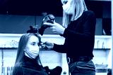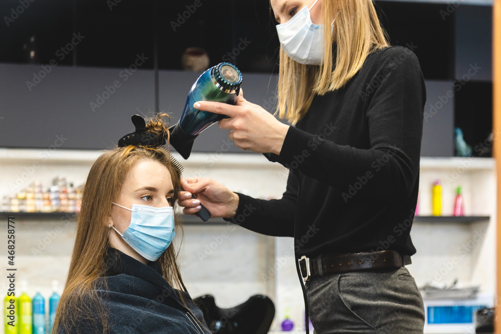 Master woman hairdresser in a medical mask dries the girl's hair with a hairdryer and combs after washing in a beauty salon. Covid-19 pandemic and remedies