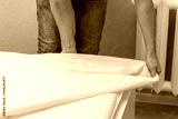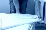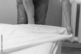 A man puts an elasticated sheet on the mattress. Change of bed linen.