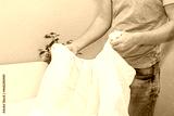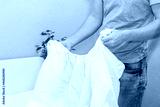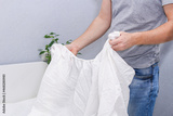 A man puts an elasticated sheet on the mattress. Change of bed linen.