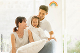 HERMOSA FAMILIA ASIÁTICA MUY SONRIENTES SENTADOS EN EL SOFÁ DE SU HOGAR CON UN ARCOIRIS EN LA PARED
