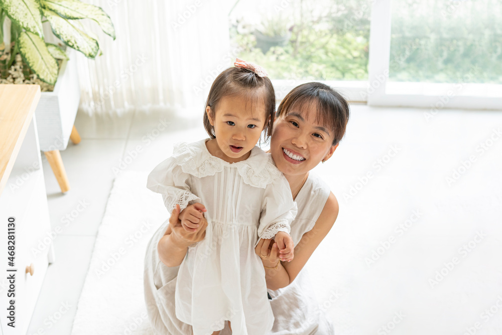 MADRE E HIJA ASIÁTICAS VIENDO A CÁMARA DENTRO DE SU HOGAR