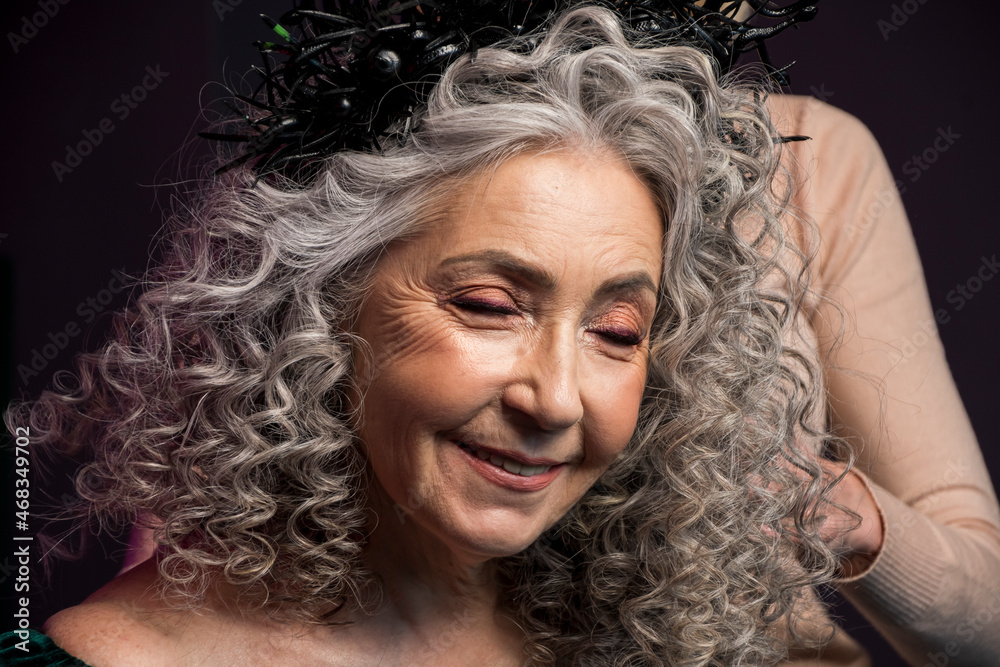 An elderly gray-haired elegant laughing woman of 60-65 years old is doing hair styling against a colored background, long curly hair. Stylish mature woman. Concept: stylish grandmother, fashionable.