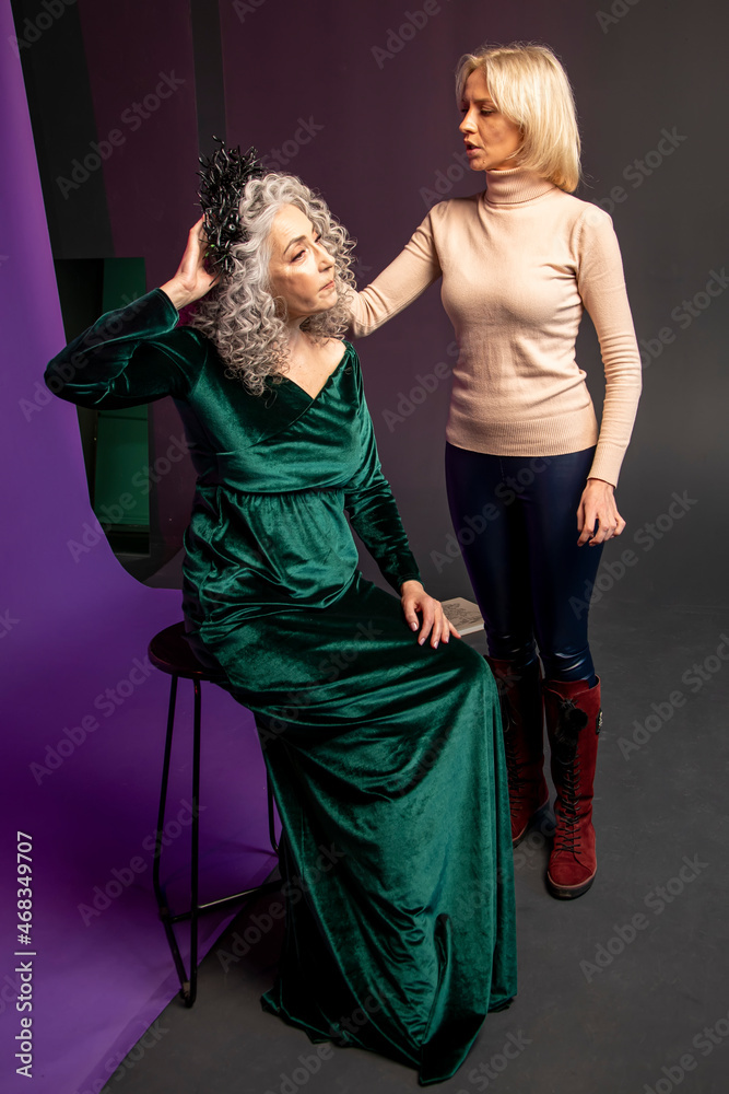 A blonde makeup artist adjusts the hairstyle of an elderly gray-haired stylish woman with long curly hair in a luxurious dress.