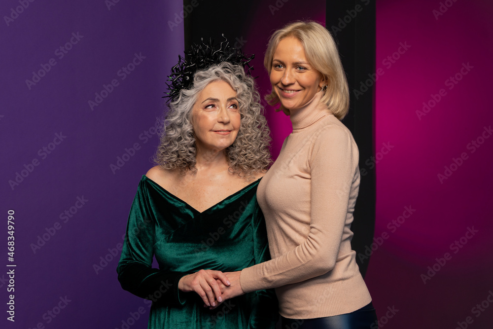 An elderly woman holds the hand of a young blonde on a colored background in the studio. Perhaps they are a grandmother and her granddaughter. The women are smiling.