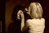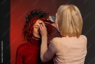 Woman with red hair doing makeup Beautician, applying powder to her face with a large brush, powdering the skin, selective focus.