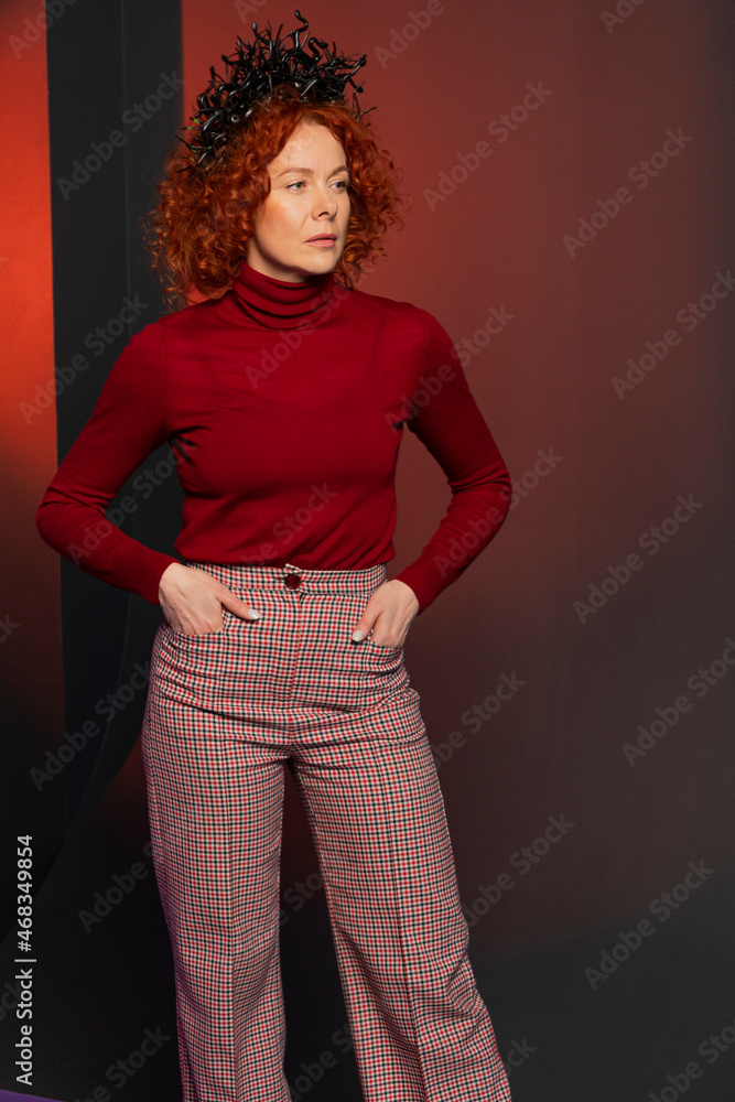 Studio portrait of a serious woman 35-40 years old with red hair and a crown on her head in the form of snakes on a colored background, hands in pockets.