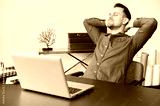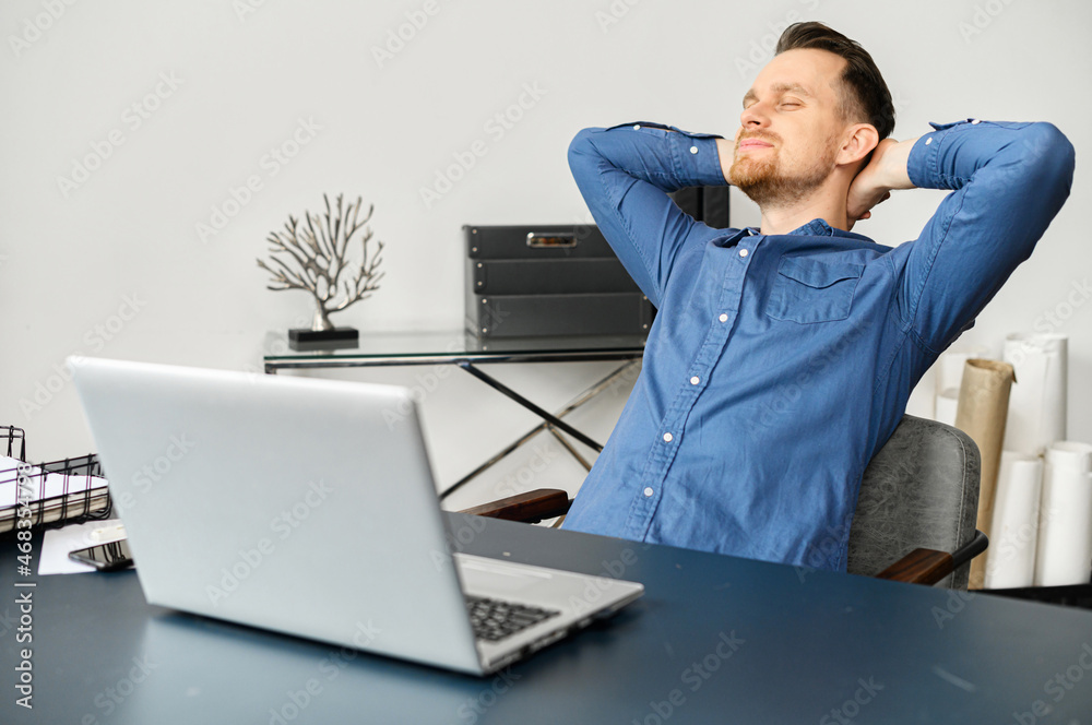 Peaceful millennial guy sitting at the desk in the modern home office, feeling excited for completing the project, placed hands behind head and stretching, enjoying remote freelance job