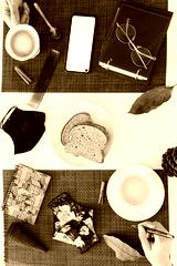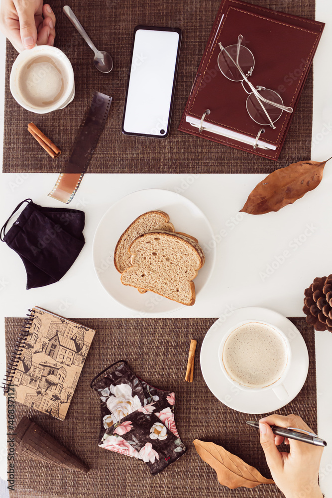 Flat lay, top view of a couple, or coworkers taking breakfast with coffee and mask on white table. Cafe, restaurant on pandemic concept.