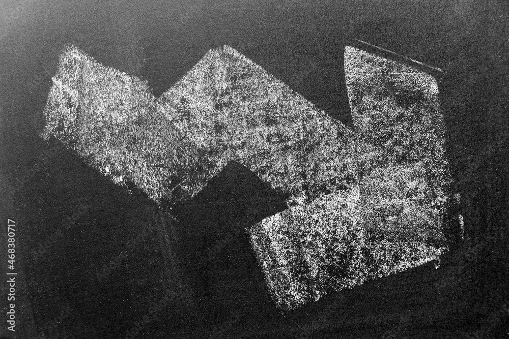 White color chalk hand drawing in arrow down shape on black board background (Concept of stock decline, down trend of business, economy)