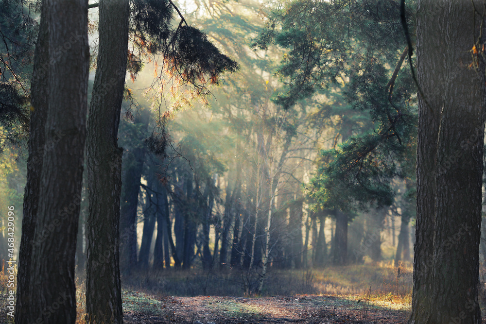 early morning forest in fog with sunbeams