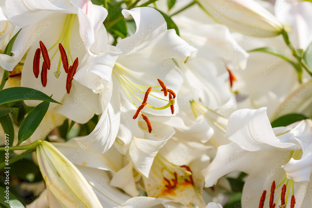 Beautiful oriental hybrids in bloom. Growing bulbous oriental lilies in the garden. Bright flower of oriental hybrids. Floral background.
