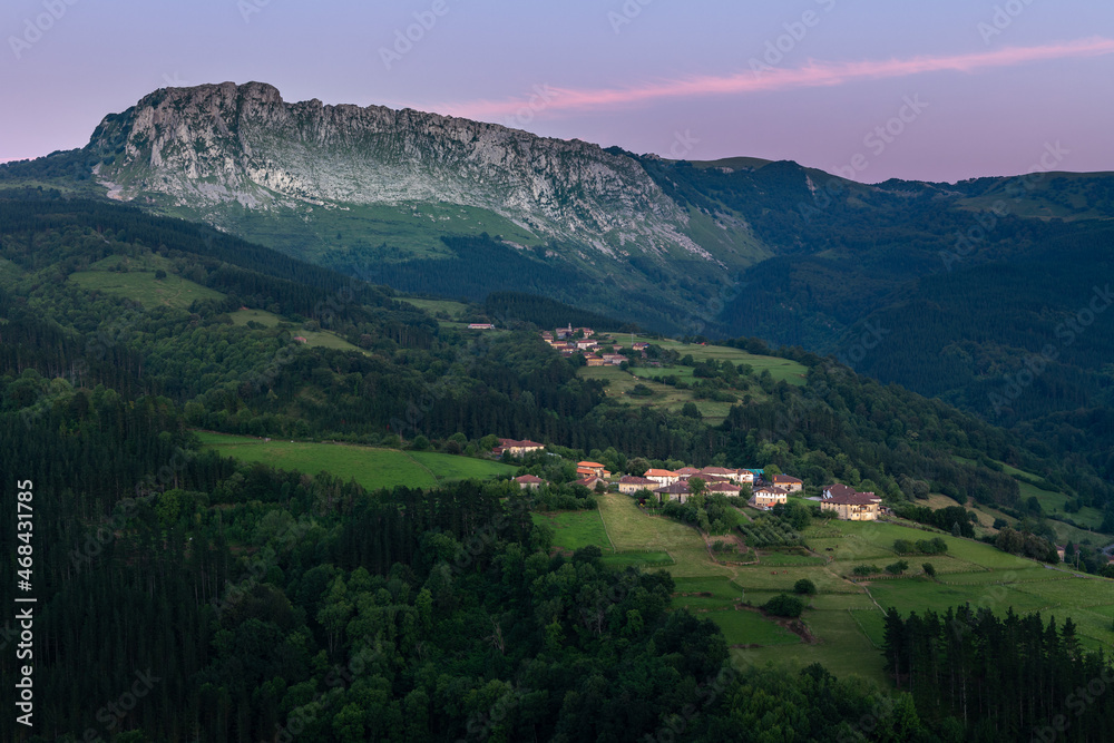 Itxina mountain with Zaloa and Urigoiti villages at sunset. Orozko, Basque Country