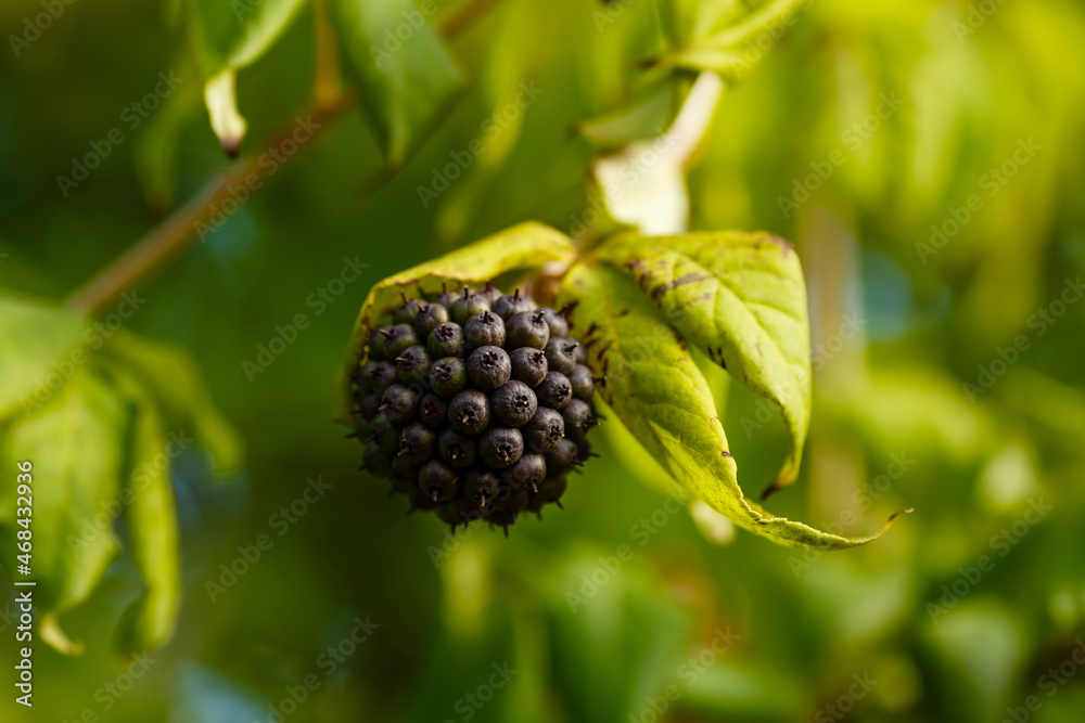 Berries of Eleutherococcus senticosus in natural background. Eleutherococcus is a genus of plants of the Aralii family. Medicinal plants in the garden.