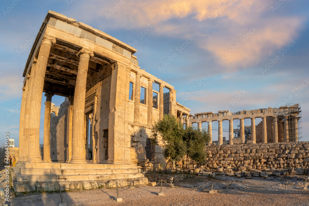 Erechtheion Temple (Erechtheum) with the Caryatids at the archaeological site of Acropolis in Athens, Greece. Parthenon Temple in the background. Panoramic view, colorful clouds, golden light. sky