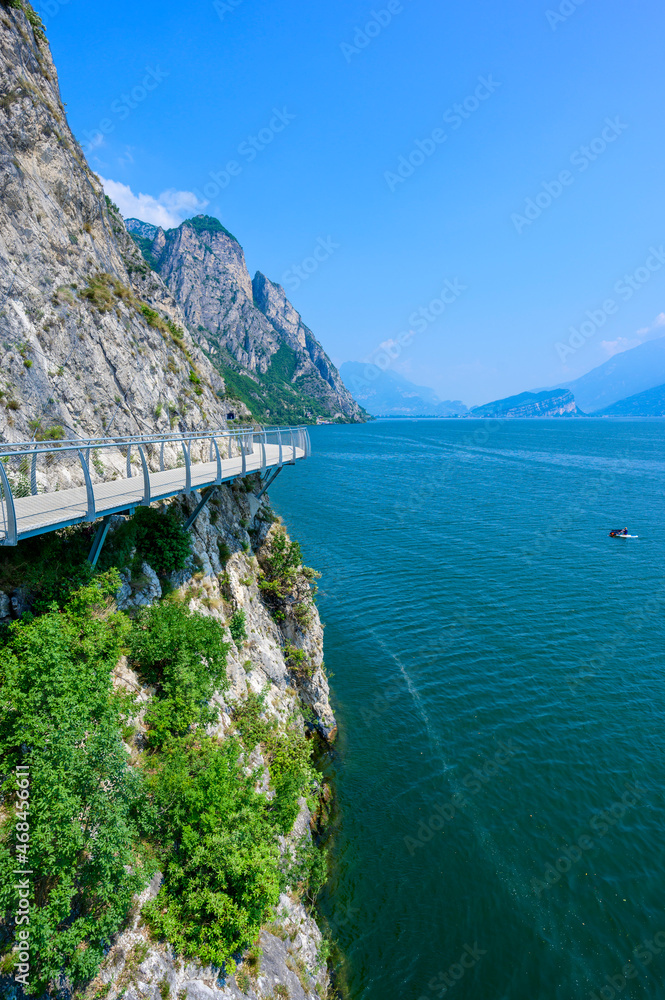 "Ciclopista del Garda" - Bicycle road and foot path over Garda lake with beautiful landscape scenery at Limone Sul Garda - travel destination in Brescia, Italy