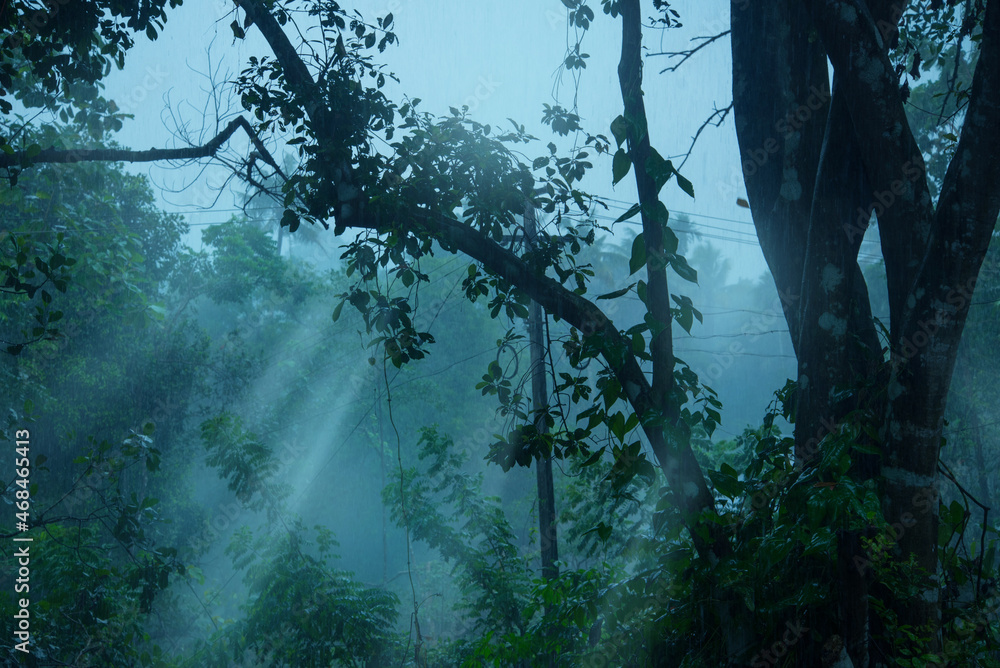 Natural sun light rays shining through tree branches in rainy morning, Kerala Monsoon Rain photography