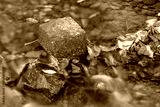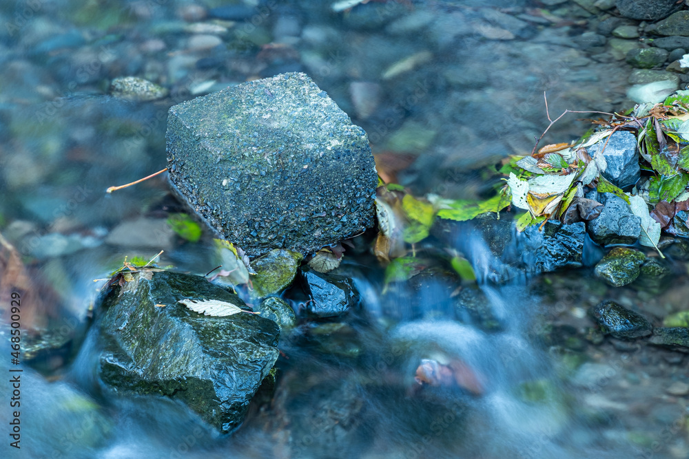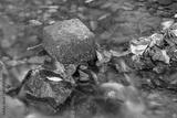 a block of concrete in the middle of the creek with stream of water run over and few fall leaves stuck on it