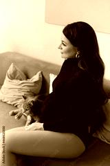 Lovable pregnant young woman in black bodysuits sits on the sofa with cute cat