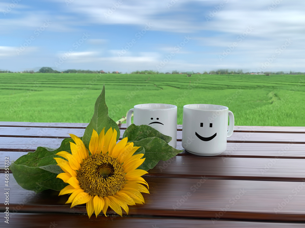 Sunflower and two white cups of tea or coffee, with sad face and smiling happy face emoticon on it on the wooden table with blue sky over green field view background. Life better when you smile.