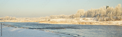 White frost in beautiful sunny winter day in river Venta, Kuldiga, Latvia.