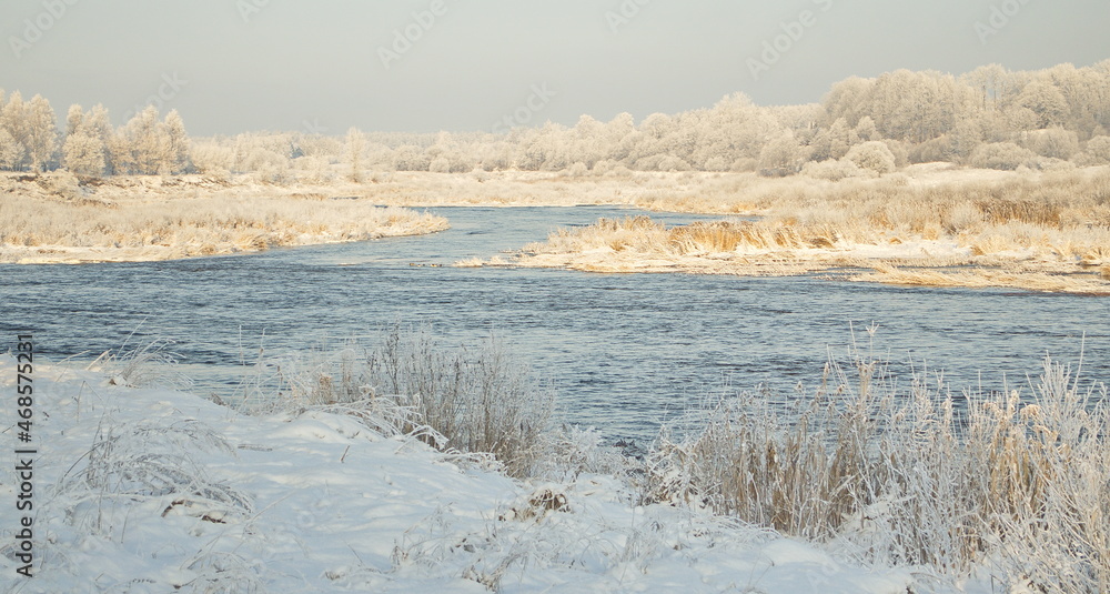 White frost in beautiful sunny winter day in river Venta, Kuldiga, Latvia.