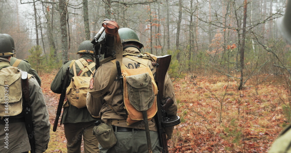 Historical Re-enactment. Re-enactors Dressed As American Soldiers Of USA Infantry Of World War II Marching Walking Along Forest Road In Autumn Day. Group of Soldiers Marching In Forest