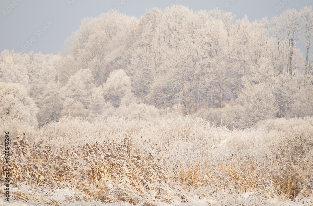 White frost in beautiful sunny winter day in river Venta, Kuldiga, Latvia.