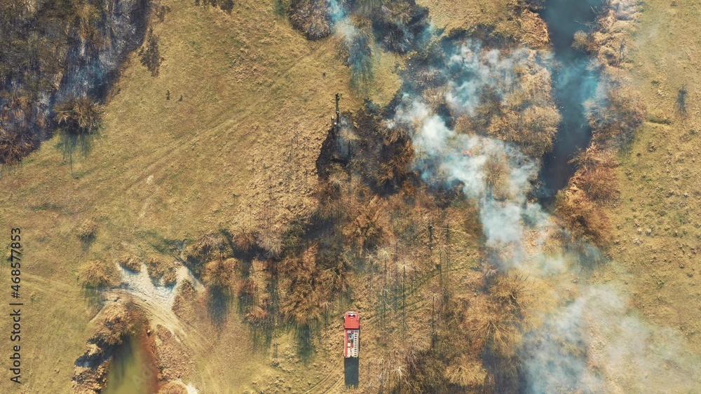 Aerial View. Spring Dry Grass Burns During Drought Hot Weather. Bush Fire And Smoke. Fire Engine, Fire Truck On Firefighting Operation. Wild Open Fire Destroys Grass. Ecological Problem Air Pollution