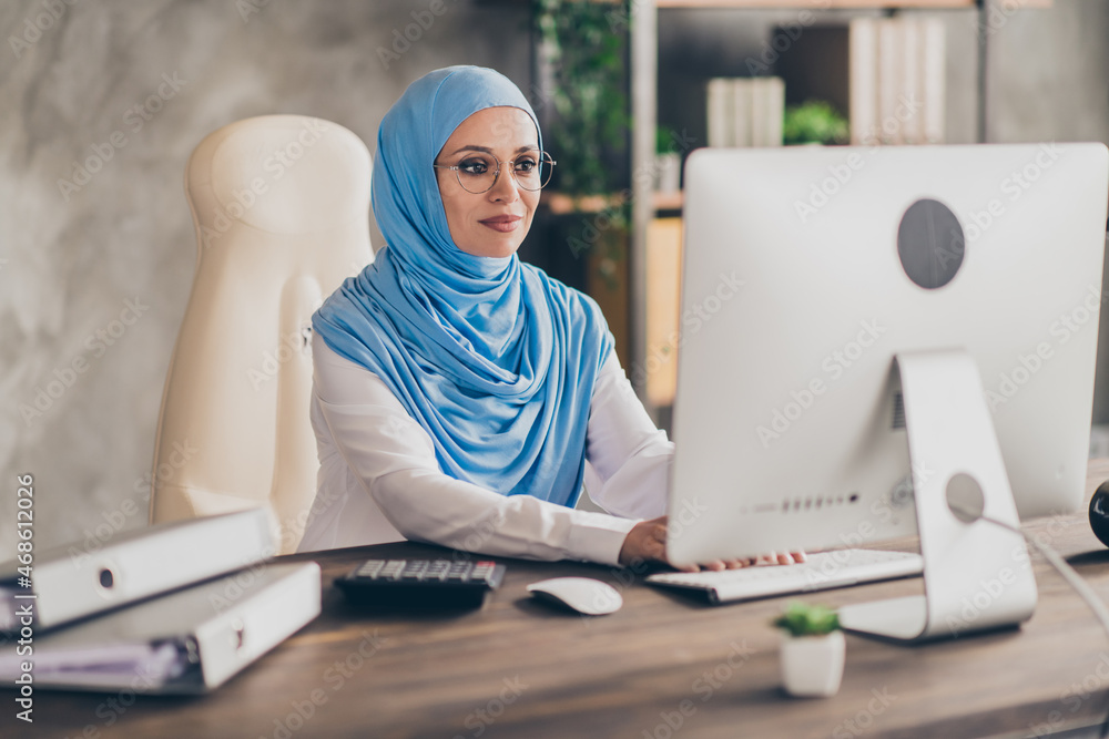 Profile side photo of young pretty arab woman browse chat computer project report agent economist indoors