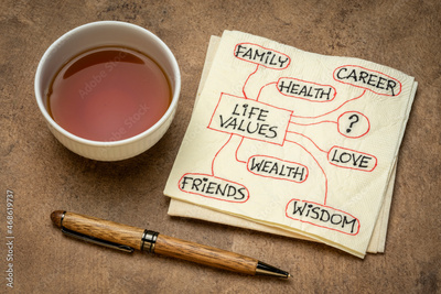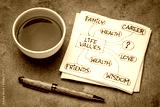 napkin sketch of possible life values - career, family, wealth, love, friends, health, wisdom, personal development and lifestyle concept