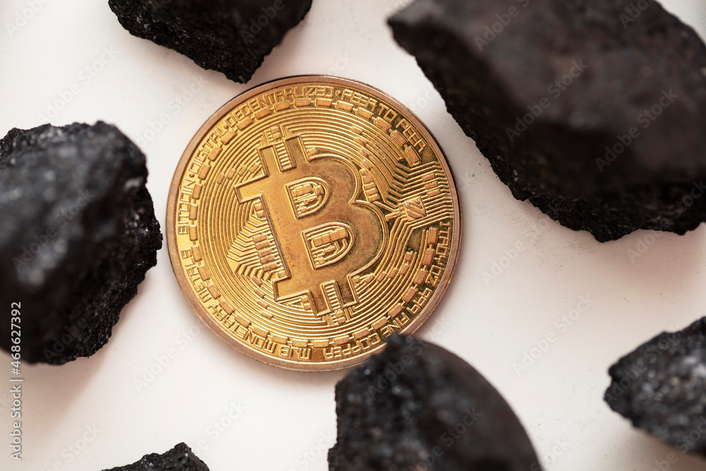 Bitcoin mining concept. Gold bitcoin cryptocurrency coin with lumps of coal