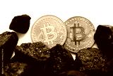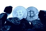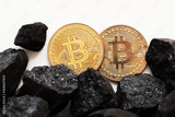Bitcoin mining concept. Gold bitcoin cryptocurrency coin with lumps of coal
