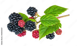 Beautiful ripe and ripening blackberries on twig isolated on white background. Rubus fruticosus. Closeup of black or red berries and green leaves on nature bramble branch. Healthy summer forest fruit.
